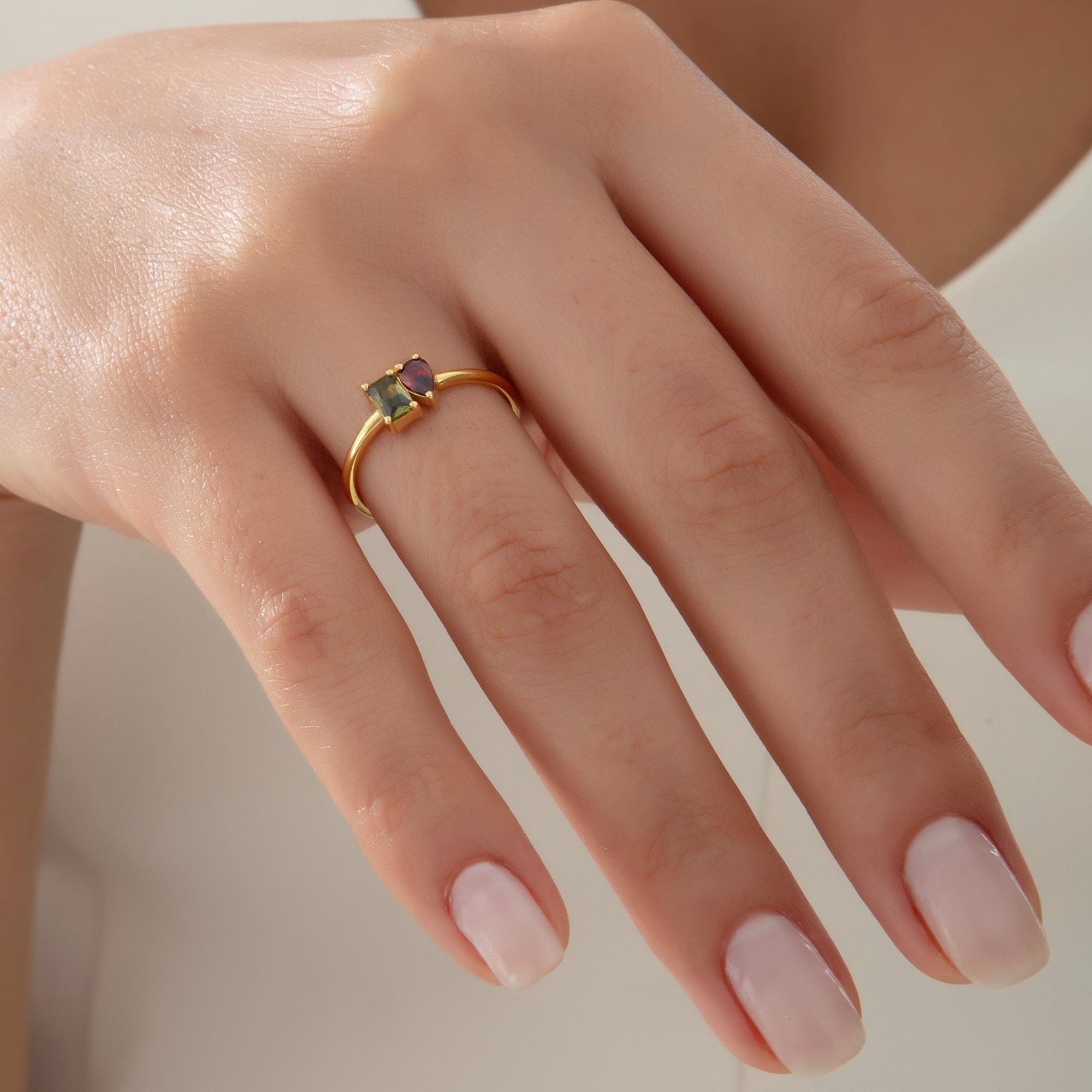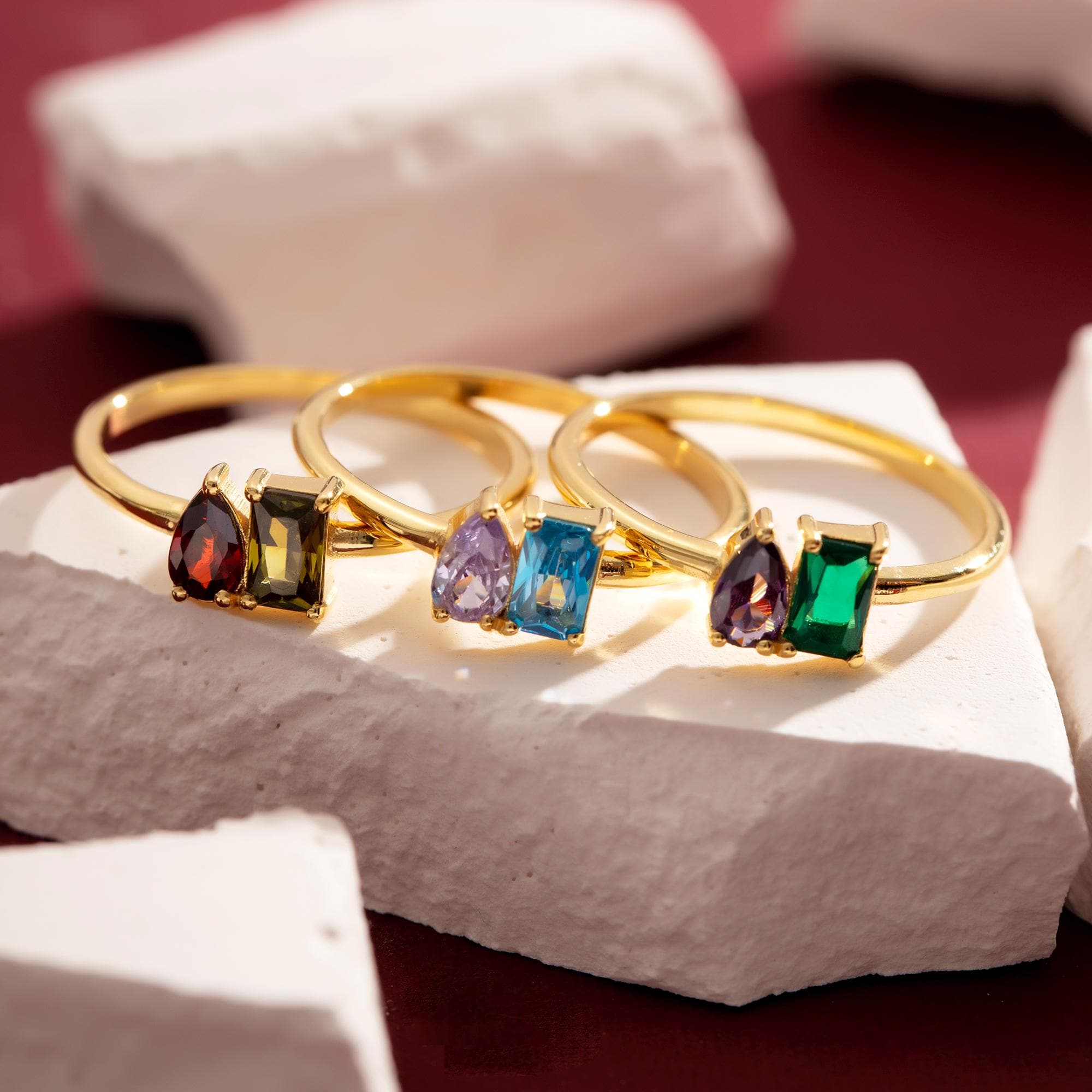 Celebrate love, connection, and individuality with our Toi et Moi Birthstone Ring — a dainty, colorful piece that symbolizes two souls, two moments, or two milestones. Featuring a pear-cut and an emerald-cut cubic zirconia stone set side-by-side, this ring makes a meaningful gift for birthdays, anniversaries, or simply self-celebration. Choose your two favorite birthstones and create a ring that tells your story ♡